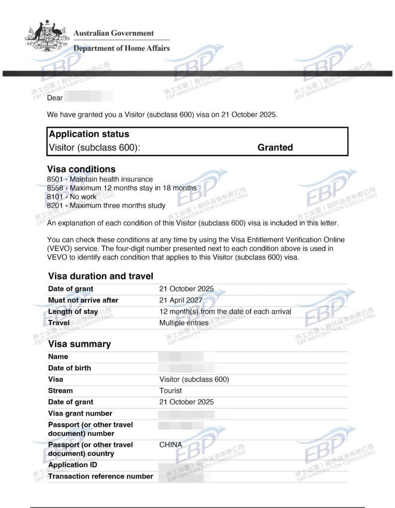 阿姨顺利获批:Subclass 600 访客签证有效期 1 年,可多次往返