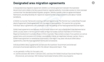 DAMA(Designated Area Migration Agreements)是澳大利亚政府与各州指定区域签署的特殊劳工协议,目前全澳有12个担保地区。